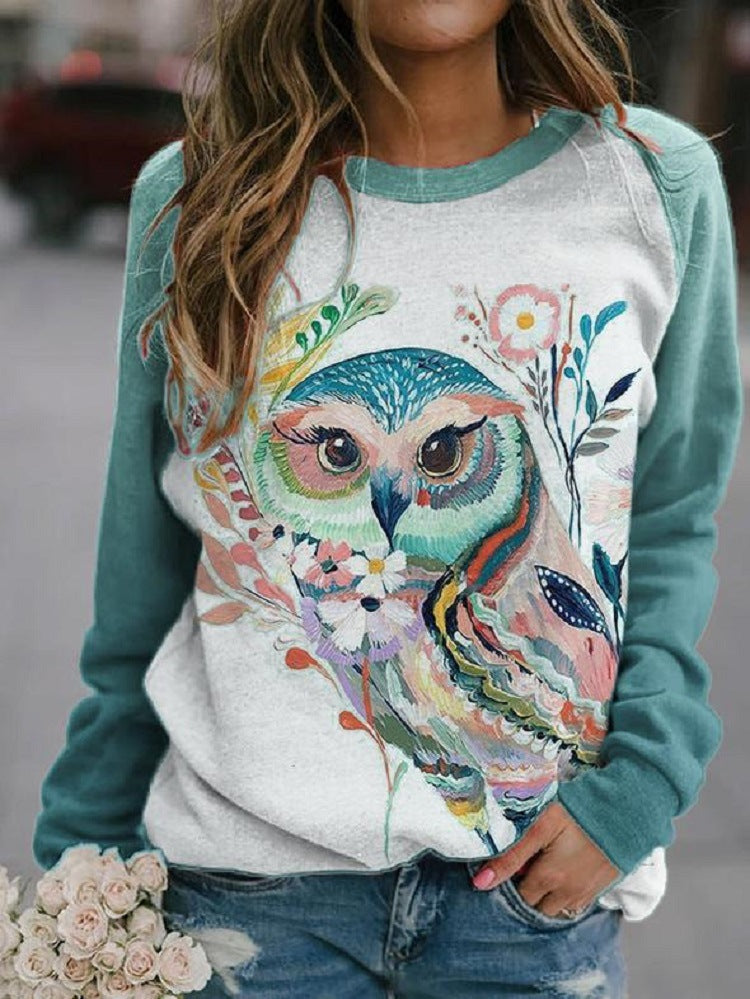 Vintage Print Casual Loose Sweatshirt Cute Owl Graphic Printed Pullover