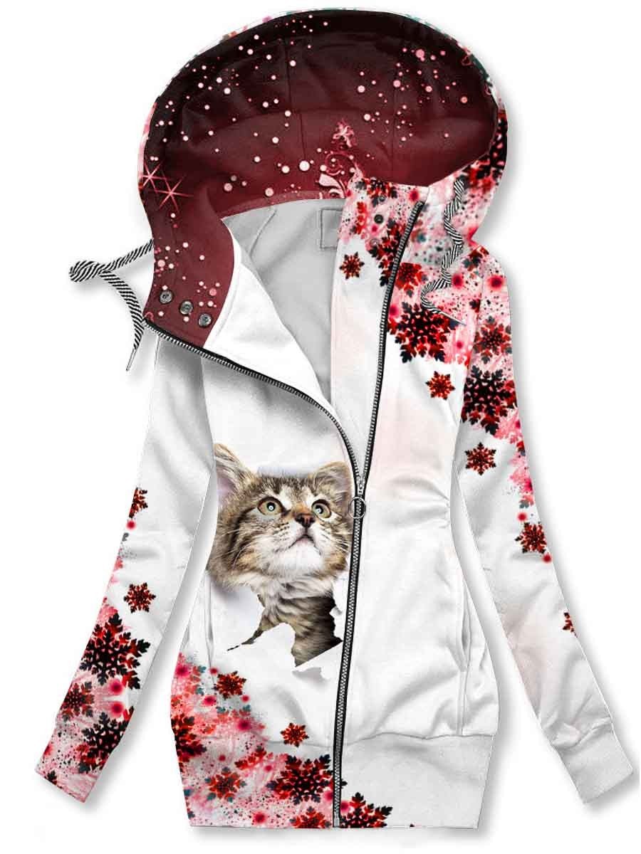 Women's Christmas Snowflake Cat Printed Hooded Sweatjacke