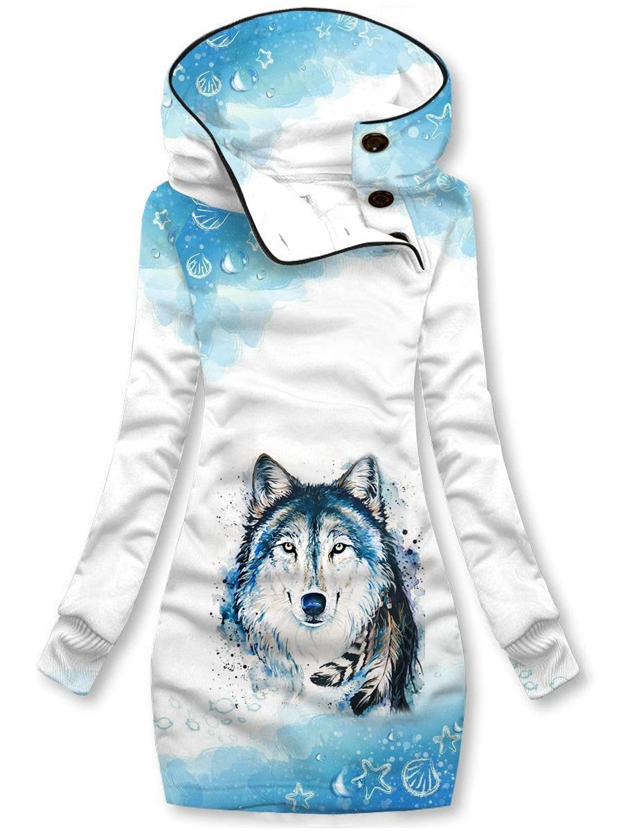 Women's Winter Wolf Print Casual Hooded Sweatshirt Dress