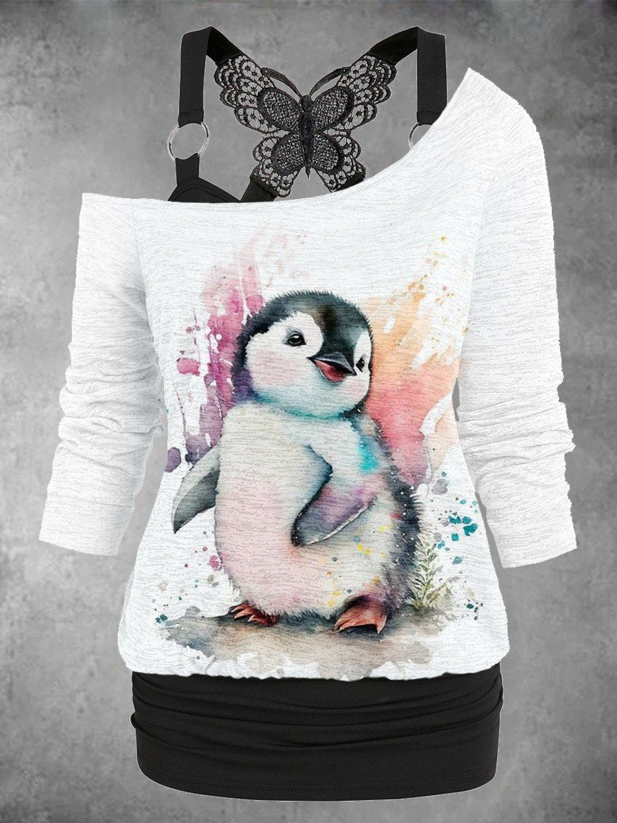 Women's Cute Penguin Art Design Casual Two Piece Suit Top