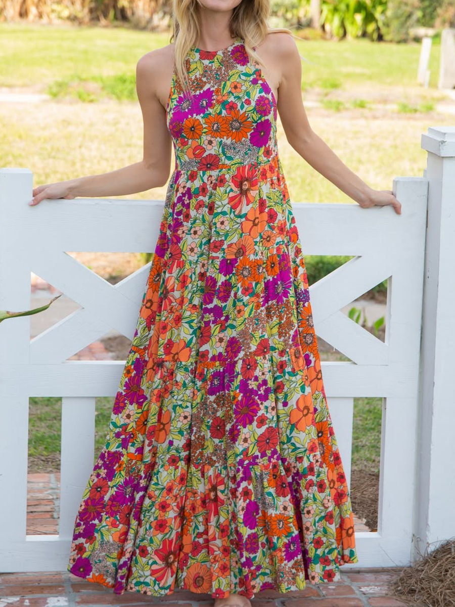 Women's floral print linen and cotton sleeveless maxi dress