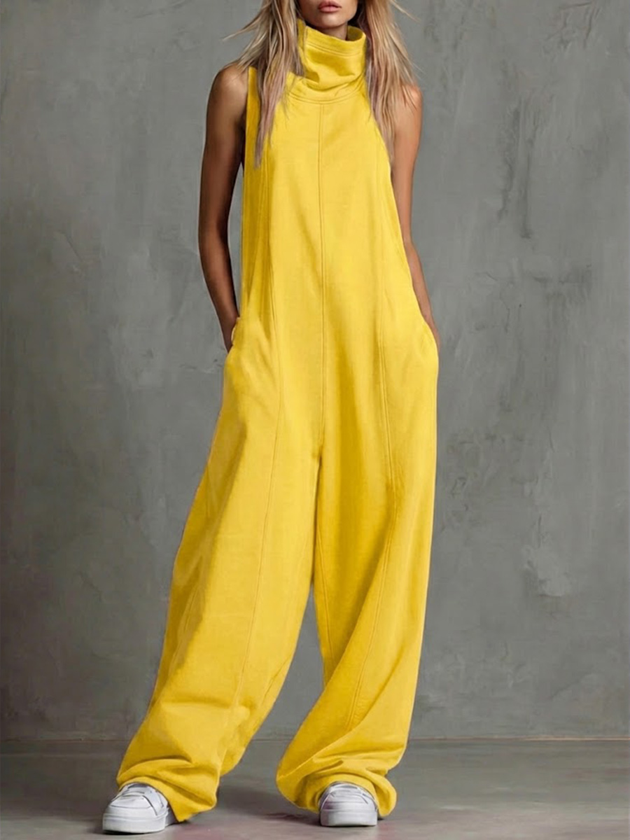 Women's Solid Color Stand-collar Sleeveless Casual Loose Cotton Wide-leg Jumpsuit