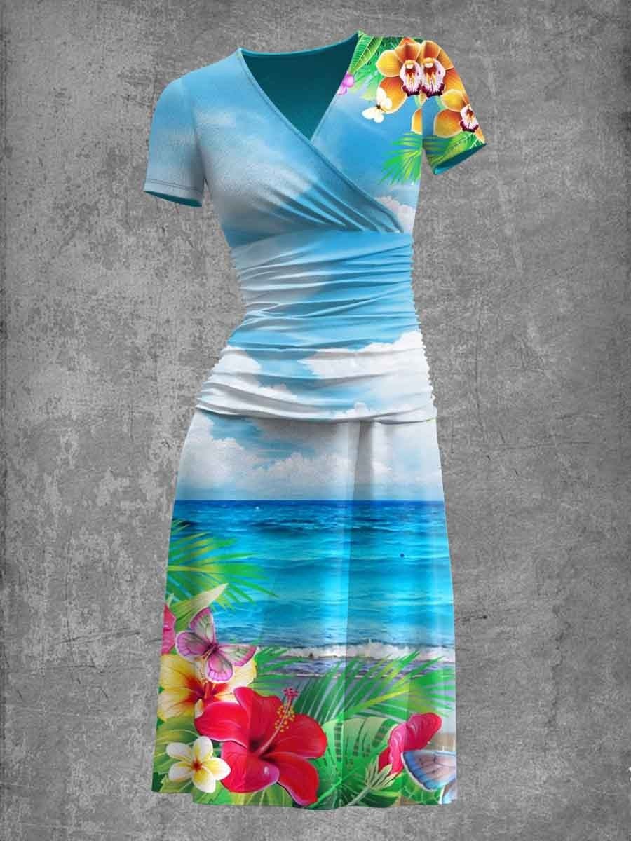 Women's Summer Hawaii Flower Art Printed Panel Dress