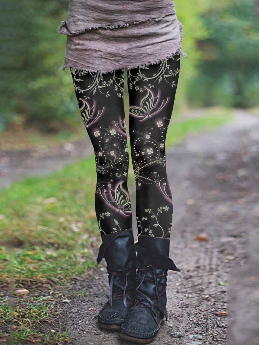 Women's Vintage Floral Butterflies Pattern Printed Casual Tight Leggings